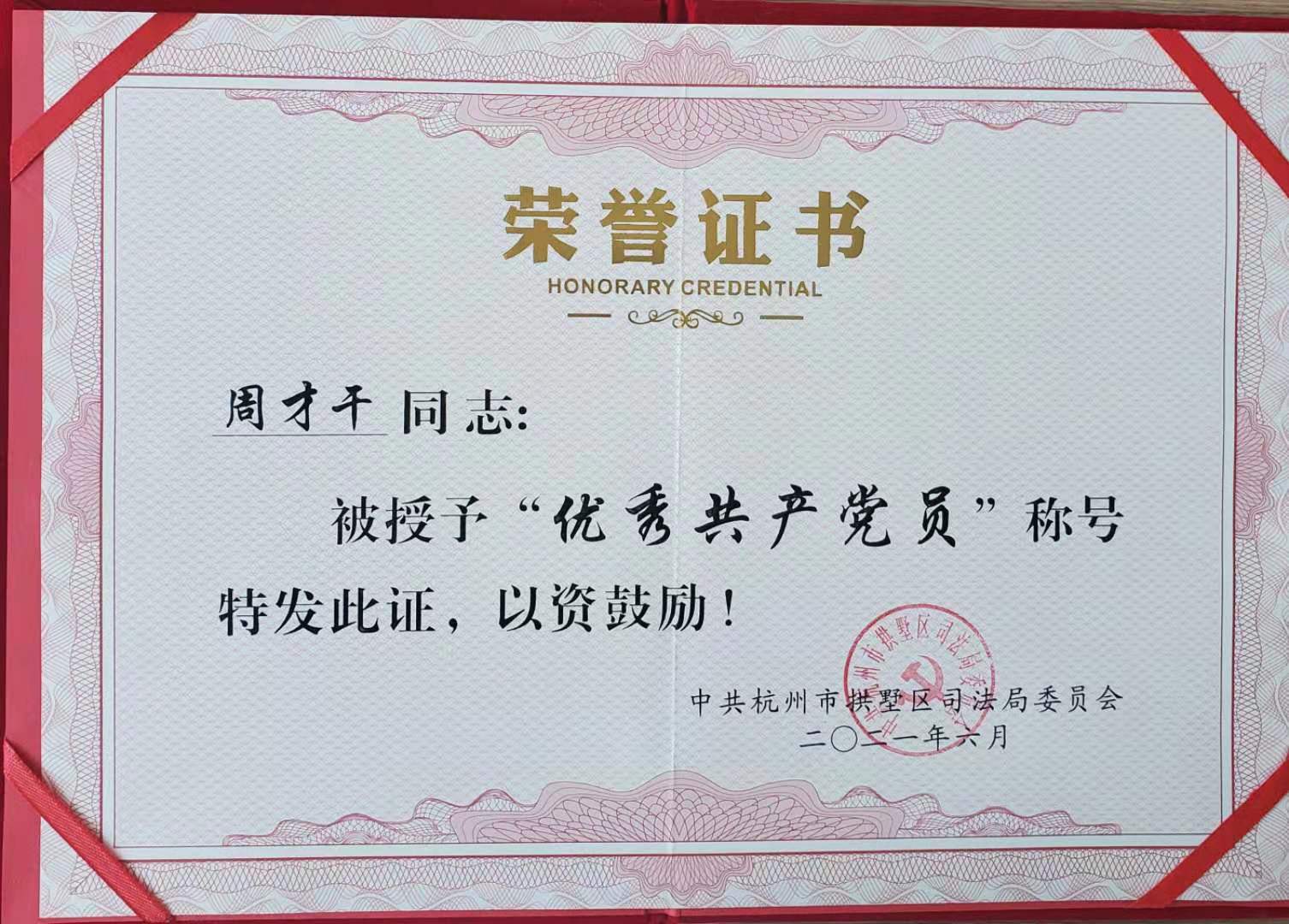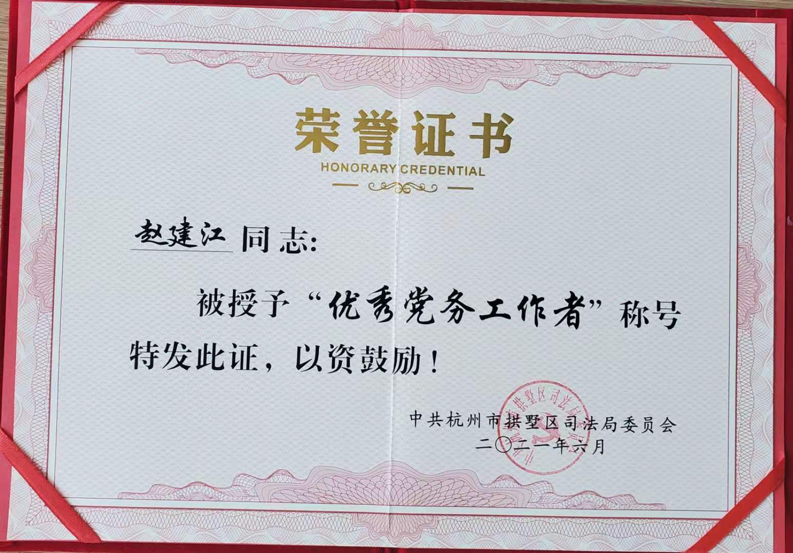 会上杭州市拱墅区司法局授予浙江法校律师事务所童丽玲律师“优秀律师”称号、周才干律师“优秀共产党员”称号、赵建江“优秀党务工作者”称号。
