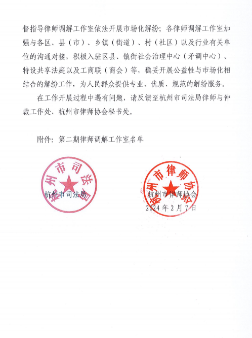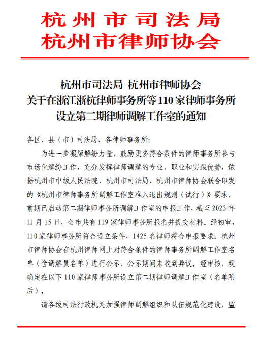 为贯彻落实《最高人民法院司法部关于开展律师调解试点工作的意见》,《杭州市中级人民法院杭州市律师协会关于建立律师参与多元化纠纷解决机制的会议纪要》等文件精神,为进一步凝聚解纷力量,鼓励更多符合条件的律师事务所参与市场化解纷工作,充分发挥律师在预防和化解矛盾纠纷中的专业、职业和实践优势,依据杭州市中级人民法院、杭州市司法局、杭州市律师协会联合印发的《杭州市律师事务所调解工作室准入退出规则(试行)》要求,经杭州市律师协会研究决定,浙江法校律师事务所正式获批成立律师调解工作室。