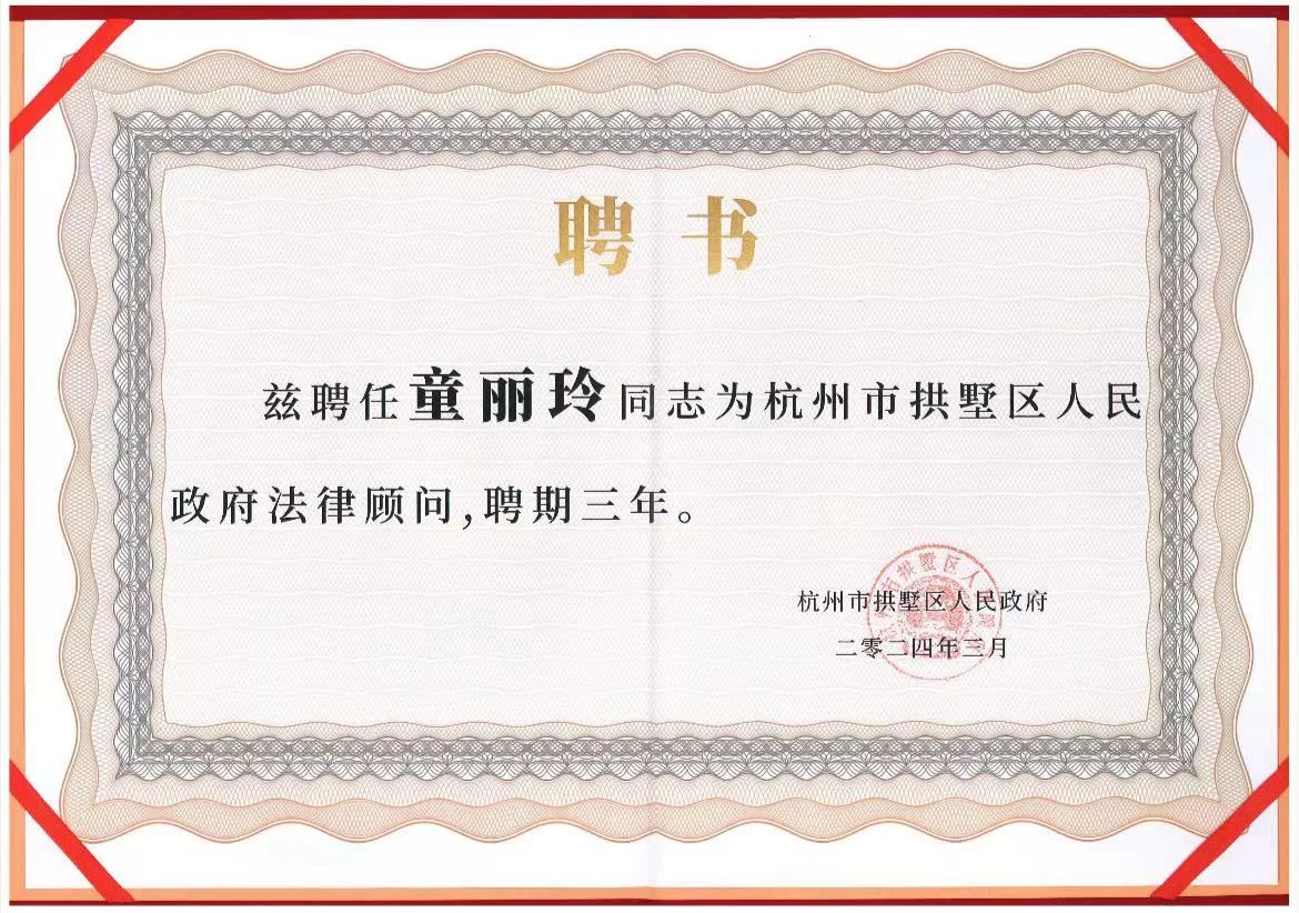2024年3月12日,杭州市拱墅区举行区政府法律顾问聘任仪式。我所童丽玲律师受聘担任拱墅区人民政府法律顾问,拱墅区区长冯晶出席聘任仪式并为法律顾问颁发聘书。