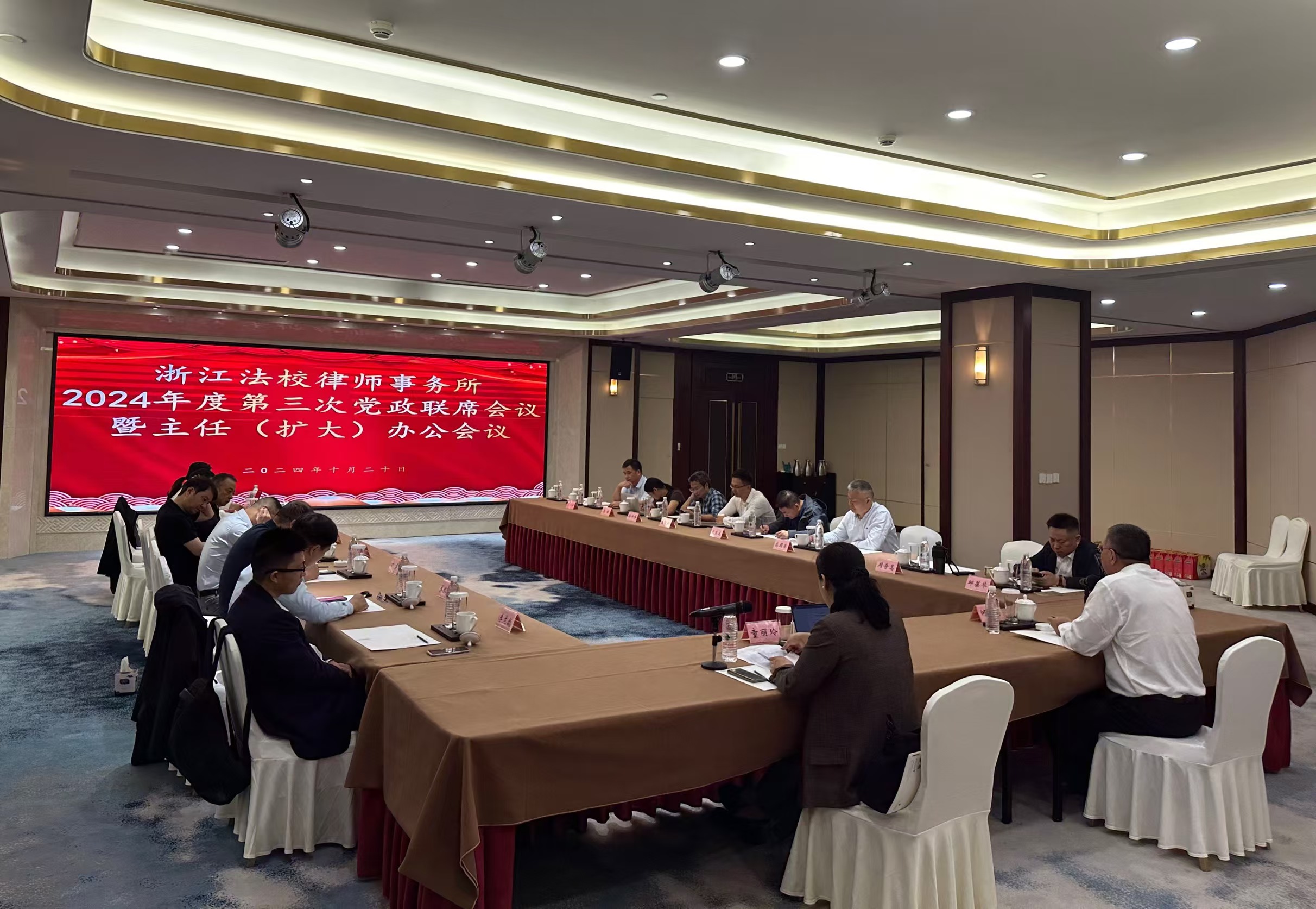 2024年10月20日上午,浙江法校律师事务所在诸暨开元大酒店召开本年度第三次党政联席会议暨主任(扩大)办公会议,法校总所党政班子成员、法校咨管会班子成员、法校分所负责人、法校业务部负责人参加了本次会议。