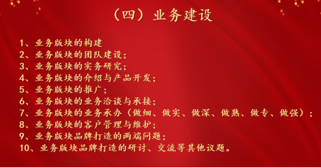 (四)、业务建设。重点讨论业务版块的研判与构建;业务版块的引领与组织;业务版块的实务研究与产品开发;业务版块的技能提升与市场推广;业务版块的洽谈模式与业务承接;业务版块的业务承办与业务管理;业务版块的服务指引与服务要求;(做细、做实、做深、做熟、做专、做强)业务版块的客户管理与客户维护;业务版块建设的两端问题;业务版块品牌打造的研讨、交流等。