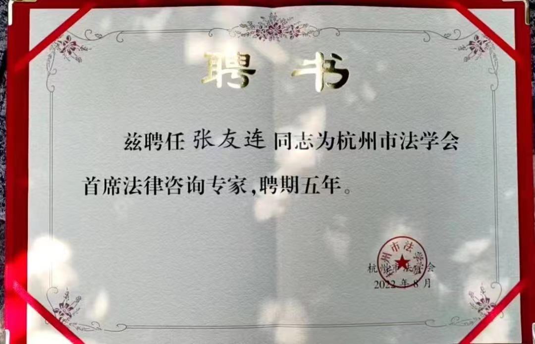 我所张友连律师获聘杭州市法学会首席法律咨询专家