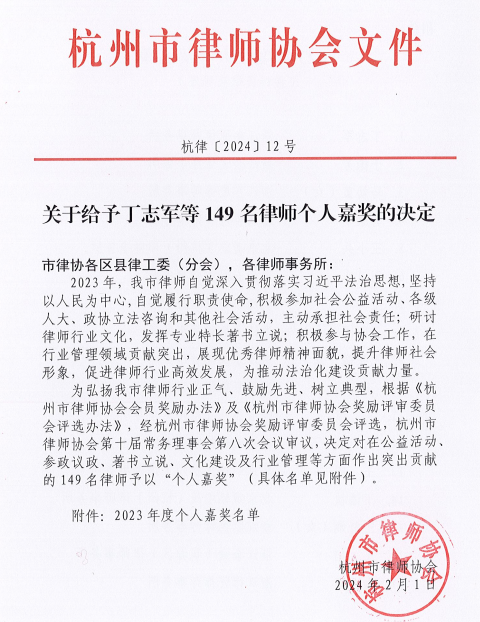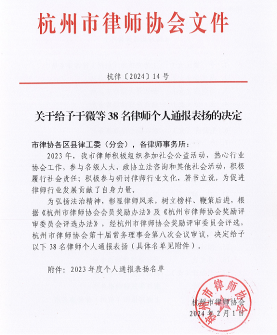 我所执行主任童丽玲律师,积极参加社会公益活动、各级人大、政协立法咨询和其他社会活动,主动承担社会责任;积极参与协会工作,在行业管理领域贡献突出,展现优秀律师精神面貌,提升律师社会形象,促进律师行业高效发展,为推动法治化建设贡献力量,荣获市律协“2023年度个人嘉奖”。