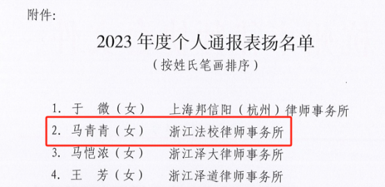 我所马青青律师主动担当作为,积极参加社会公益活动和法律援助工作,在维护弱势群体的合法权益,促进社会公平正义取得优异成绩,为保障民生,促进社会和谐稳定作出突出贡献,在法律援助工作方面表现优异,荣获“2023年度个人通报表扬”。